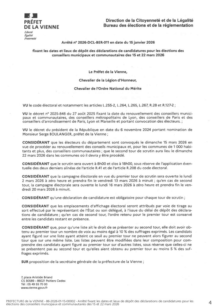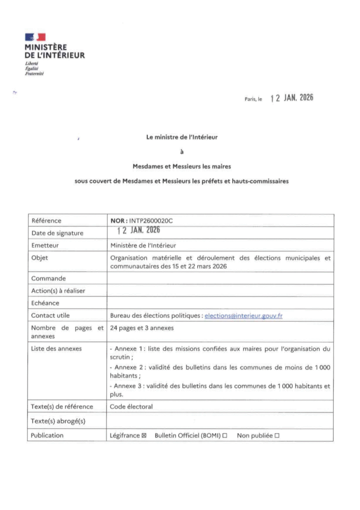 Le décret n° 2025-848 du 27 août 2025 fixe la date du premier tour des élections municipales au dimanche 15 mars 2026. Le second tour s’il y a lieu se tiendra le dimanche 22 mars 2026.